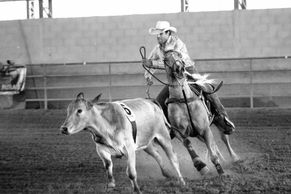 This is a variation of calf roping where a calf is roped. Once the rope is around the calf's neck, the roper signals the horse to stop suddenly. The rope is tied to the saddle horn with a string. When the calf hits the end of the rope, the rope is pulled tight and the string breaks. The breaking of the string marks the end of the run. The rope usually has a small white flag at the end that makes the moment the rope breaks more easily seen by the timer. The fastest run wins.